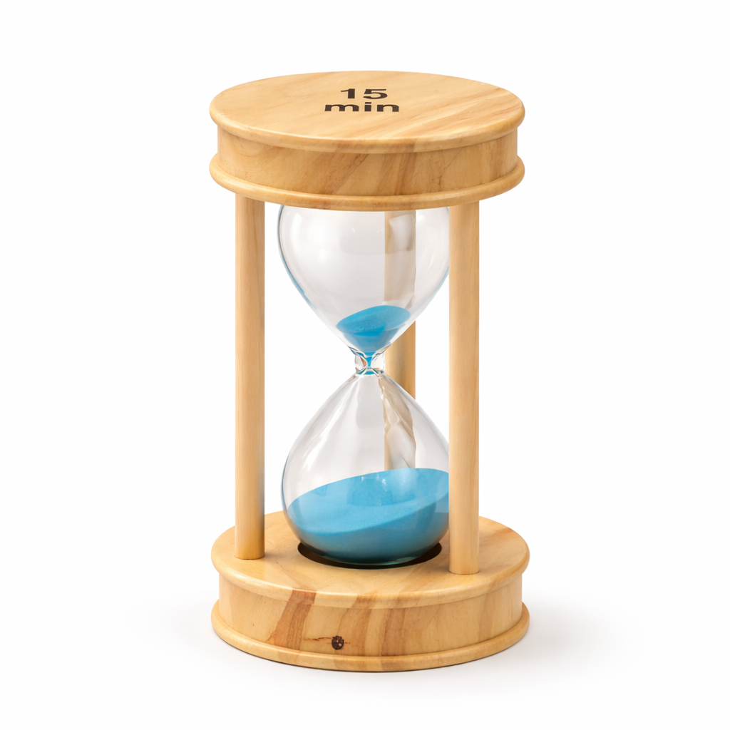A mechanical time-tracking tool designed to measure a fixed 15-minute interval without electronics.